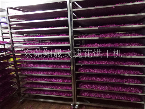 湖北襄樊某农业合作社选用东莞翔晟空气能玫瑰花烘干房安装调试完成正常使用,该空气能玫瑰花烘干房要求玫瑰花蕾和花冠烘干。空气能玫瑰花烘干房烘干物料重量1000公斤;脱水比例:5:1烘干温度:前期最高65 ℃。尾端最高70-75℃;烘干时间:花蕾 22小时;花冠18小时;单位面积物料的摆放重量: 花蕾-13斤/平方  花冠 8-9斤/平方。 以平均10斤/平方计算。物料摆放方式:物料小车+托盘小车外尺寸为:1000MM*1000MM*2000MM。小车层间距100mm 合计18层小车数量及烤房尺寸估算每台小车摆放物料的总量M小车=18层*10斤/平方=180斤=90公斤,小车的数量=1000/90=11.1车 。合计12车。烤房尺寸(参考夹芯彩钢板尺寸、下风风道预留等因素):4275*5275*2800mm