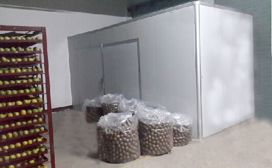 刚采收回的果实,含水量高,糖分尚末完全转化,如立即进入烘烤加工,容易出现爆果和果实甜味不够的现象。所以必须经过一段时间的糖化、发汗过程。具体做法是:将刚采回的果实平铺在室内通风阴凉处,可叠二、三层,3~4天翻动一次,让其水分自然蒸发和内部糖分的转化。在室内需要7~10天,使果实表面有50%呈现黄色,含水量蒸发去果重的10~15%,即可进入热泵烘干房烘烤。