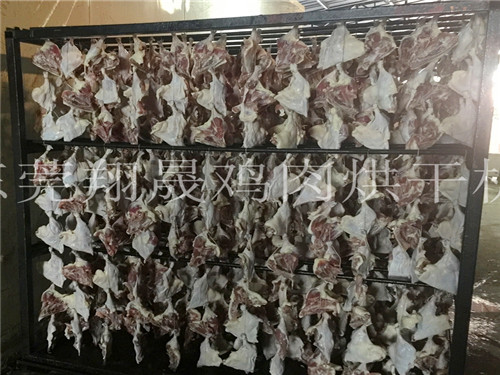 这一阶段主要的制约因素是温度,为了强化干燥速度,温度要升高到60到65度,烘干时间控制在10到12个小时,相对湿度控制在38%左右。鸡肉最终烘干湿度控制在18%范围